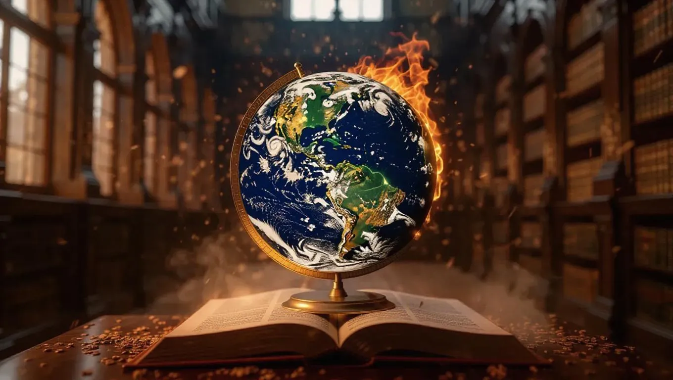A library globe spinning fiercely as continents burst into flames, oceans steaming up and turning to ash that falls like rain. Apocalyptic allegory, field lens distortion, set against a backdrop of an antiquated library and drifting writings.