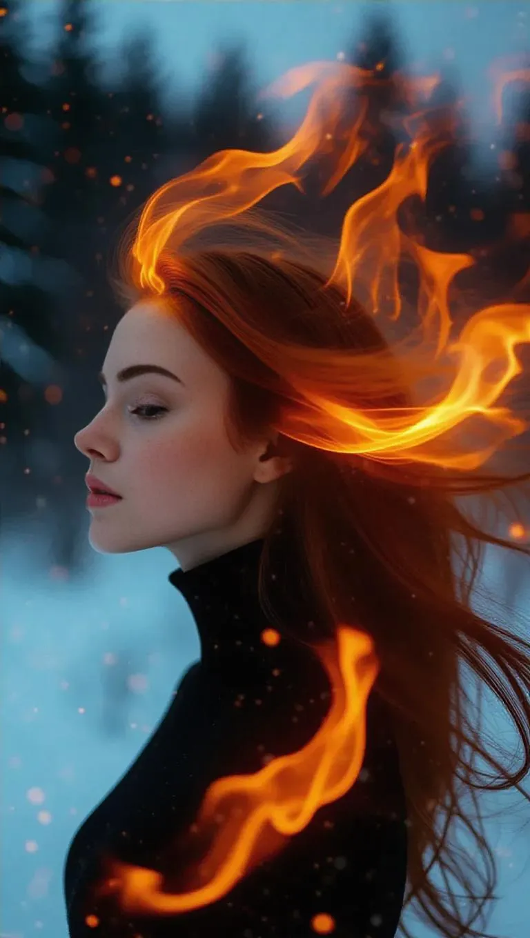 A surreal portrait of a woman with her hair transforming into vibrant flames, the fire flowing like silk in the wind, seamlessly blending with a tranquil snowy landscape, dreamy and ethereal, ultra-detailed, cinematic lighting, glowing embers.