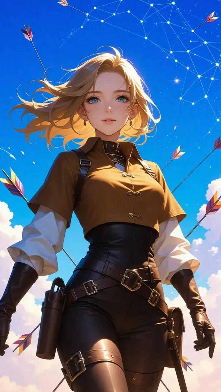 Generate a dreamy anime-style Sagittarius character with golden windswept hair, sun-kissed skin, and celestial suede attire. AI-powered animation brings floating light arrows and a constellation sky to life in this dynamic Bird's Eye View scene. Create ethereal zodiac art with vivago.ai's AI effects for mesmerizing, professional-grade illustrations and motion designs. (58 words)
