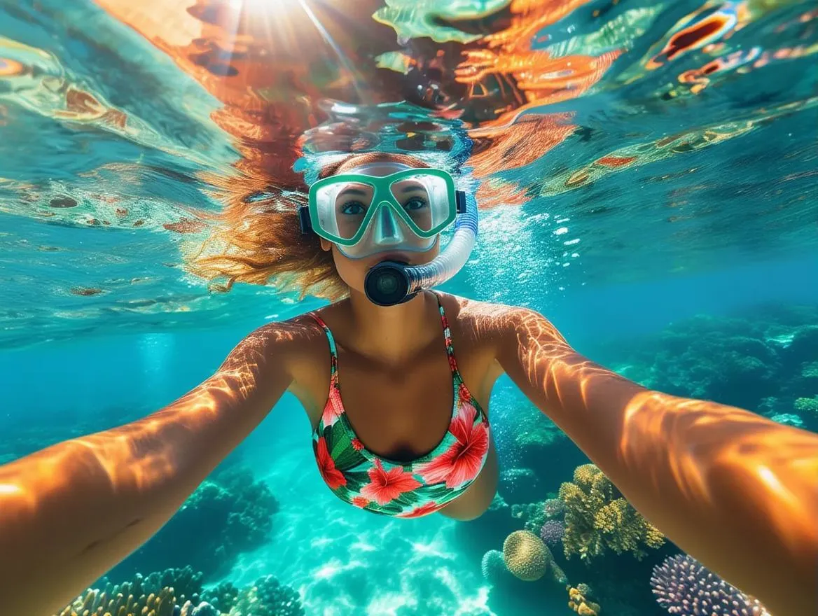 Capture stunning underwater scenes with vivago.ai's AI image generator. Photorealistic snorkeler viewed from below in tropical seas. Ultra-high resolution and texture mapping bring floral swimsuits and sunlit waters to life. Create vibrant, professional-grade aquatic visuals effortlessly.