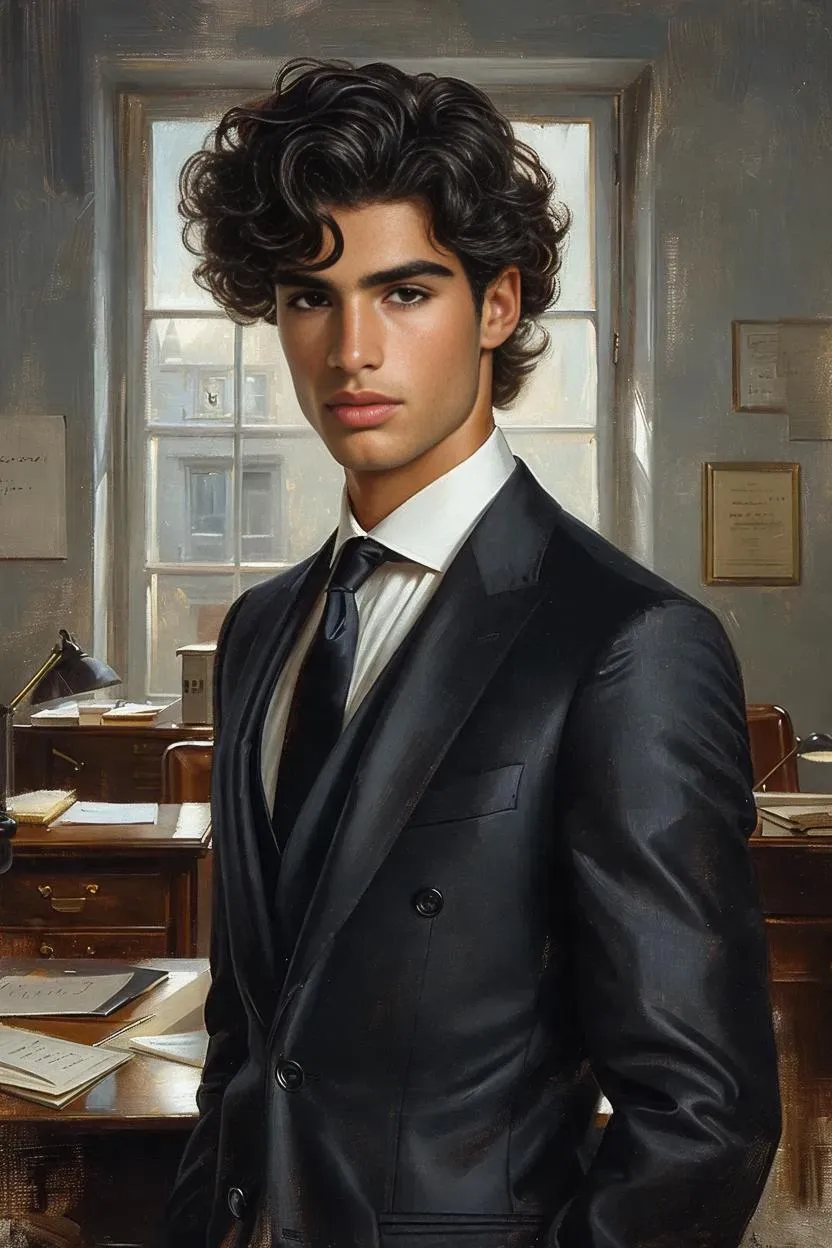 Create a striking AI-generated image of a young Italian man in a sleek dark suit, featuring black curly hair and delicate features. Perfect for professional portfolios with 8K digital painting quality, realistic office backdrop, and expert lighting contrast between soft diffusion and dramatic highlights.