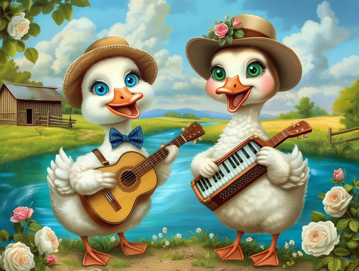 Generate a whimsical 1800s-style postcard with AI image tools: two cheerful geese—white with a guitar, brown with an accordion—smiling on a farm beside a blue-green river. Featuring roses, fluffy clouds, and vintage charm. Perfect for storytelling or gifts. Explore Vivago.ai’s AI effects for customizable, high-quality visuals and professional editing.