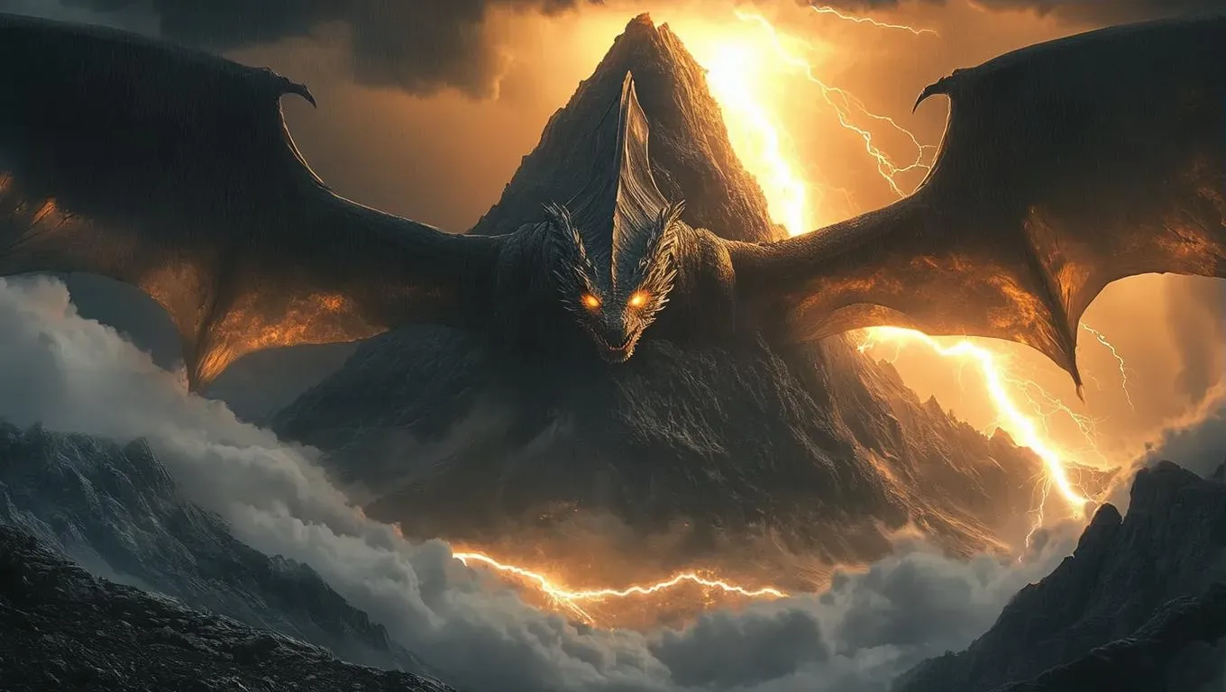 Create hyperrealistic AI-generated art of a stormy mountainscape with terrifying winged dragons emerging from lightning-blazed thunderclouds. Ultra-high definition foreground details, realistic textures, and dramatic lighting for immersive visual storytelling. Perfect for fantasy scenes, digital art projects, or epic wallpaper designs using AI image generation.