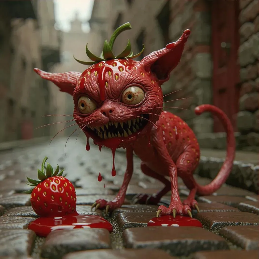 A grotesque claymation hybrid of a cat and a rotting strawberry—its matted fur blending with the oozing, pitted strawberry flesh, seeds embedded like tiny, malignant eyes across its misshapen body. Its elongated limbs twist unnaturally as it crouches, claws scratching against a crumbling cobblestone street slick with rain and something darker. Its face is unnervingly asymmetrical—one empty socket weeping sticky strawberry syrup, the other a bulbous, unblinking cat’s eye with a cracked pupil. Its jagged teeth drip with viscous red pulp as it hisses, saliva mingling with decaying fruit juice. The scene is set in a decaying industrial courtyard overrun with gnarled vines bearing oversized, misshapen fruit. Rusted machinery lies half-submerged in pools of thick, black sludge, and the air is heavy with fog, illuminated by the sickly green glow of a broken streetlight. In the distance, a stop-motion procession of other nightmarish fruit-creature hybrids emerges from the shadows, their movements jerky and unnatural. The entire scene pulses with a palpable sense of unease, each detail painstakingly hand-sculpted with a raw, tactile texture that captures the decay and grotesque beauty of this surreal, dark claymation nightmare. DARK CLAYMATION SURREALISM: Handcrafted, eerie clay textures, grotesque figures, distorted anatomy, unsettling organic movements, muted earthy tones, decaying industrial backdrops, grim lighting, shadow play, surreal stop-motion atmosphere, psychological unease, raw, tactile details.