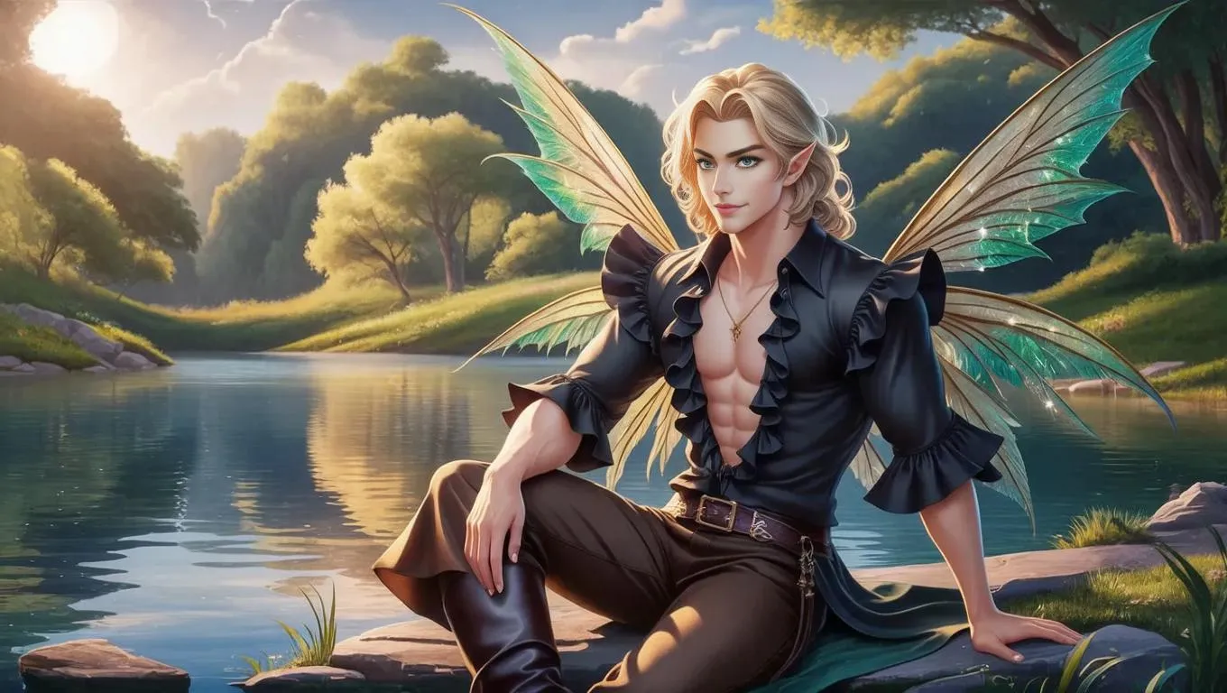 Generate an anime-style fairy man with sandy blonde hair, emerald green eyes, and sparkling wings. Full-body cartoon character in natural green tones, sitting by a lake, gazing downward. AI-powered image creation for vibrant, professional-grade anime art.