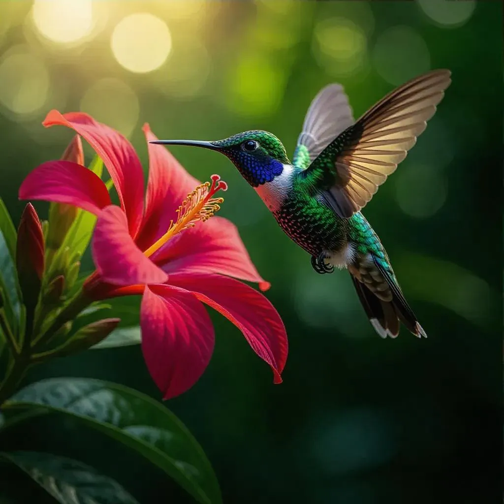 Capture a photorealistic colibri in dynamic flight near a vibrant flower, set against a lush forest backdrop with natural lighting. This hyper-detailed 32k resolution masterpiece showcases intricate feathers and lifelike motion. Perfect for wildlife photography enthusiasts and AI-generated art seekers. Explore Vivago.ai for cutting-edge AI creativity.