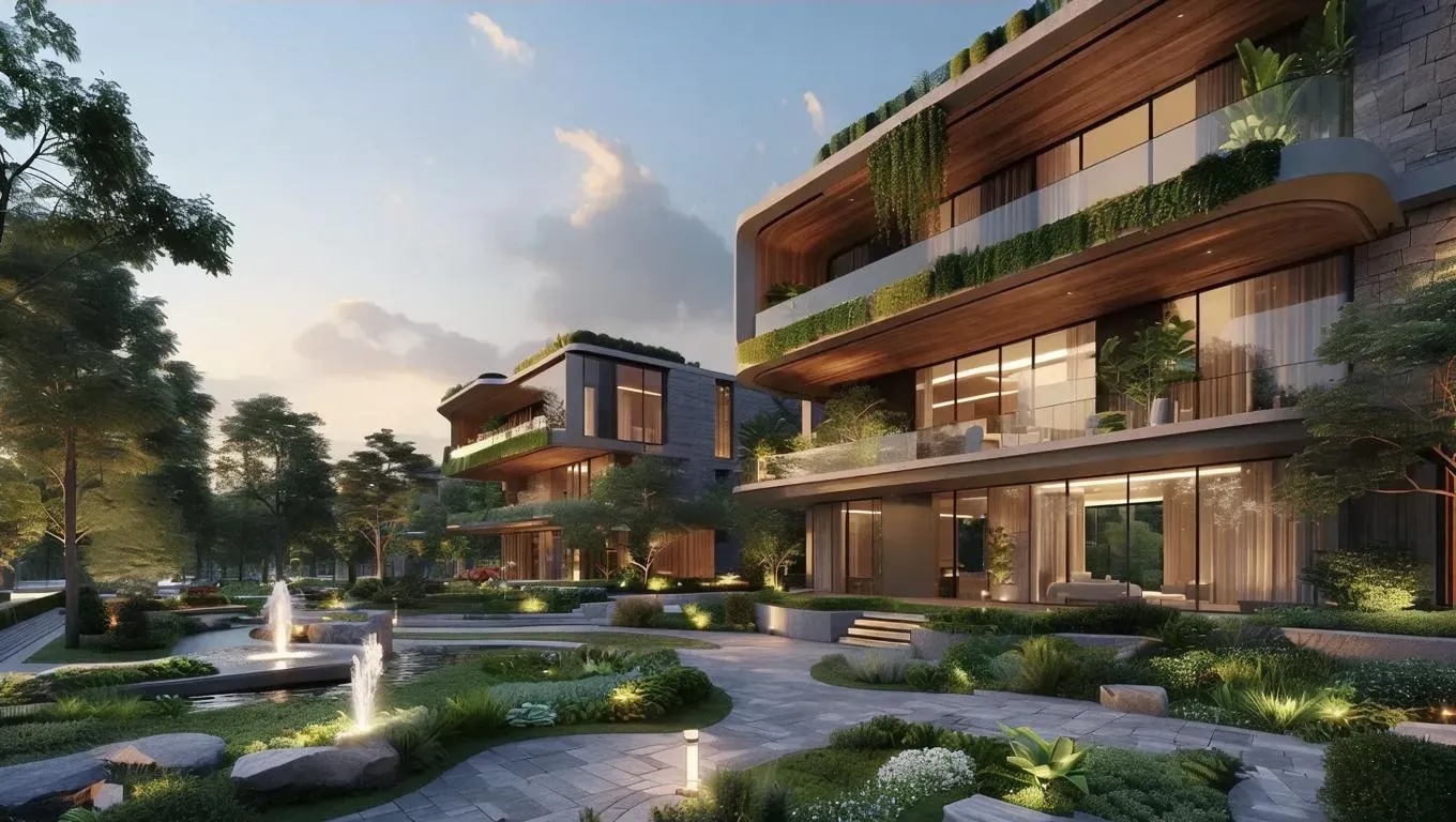 Explore AI-generated modern residential architecture with sleek designs, natural stone/wood materials, asymmetrical green balconies, and integrated LED lighting. Features urban courtyards, fountains, pathways, and warm atmospheres under clear skies. Elevate creative projects with Vivago.ai’s AI tools for professional-grade visuals.