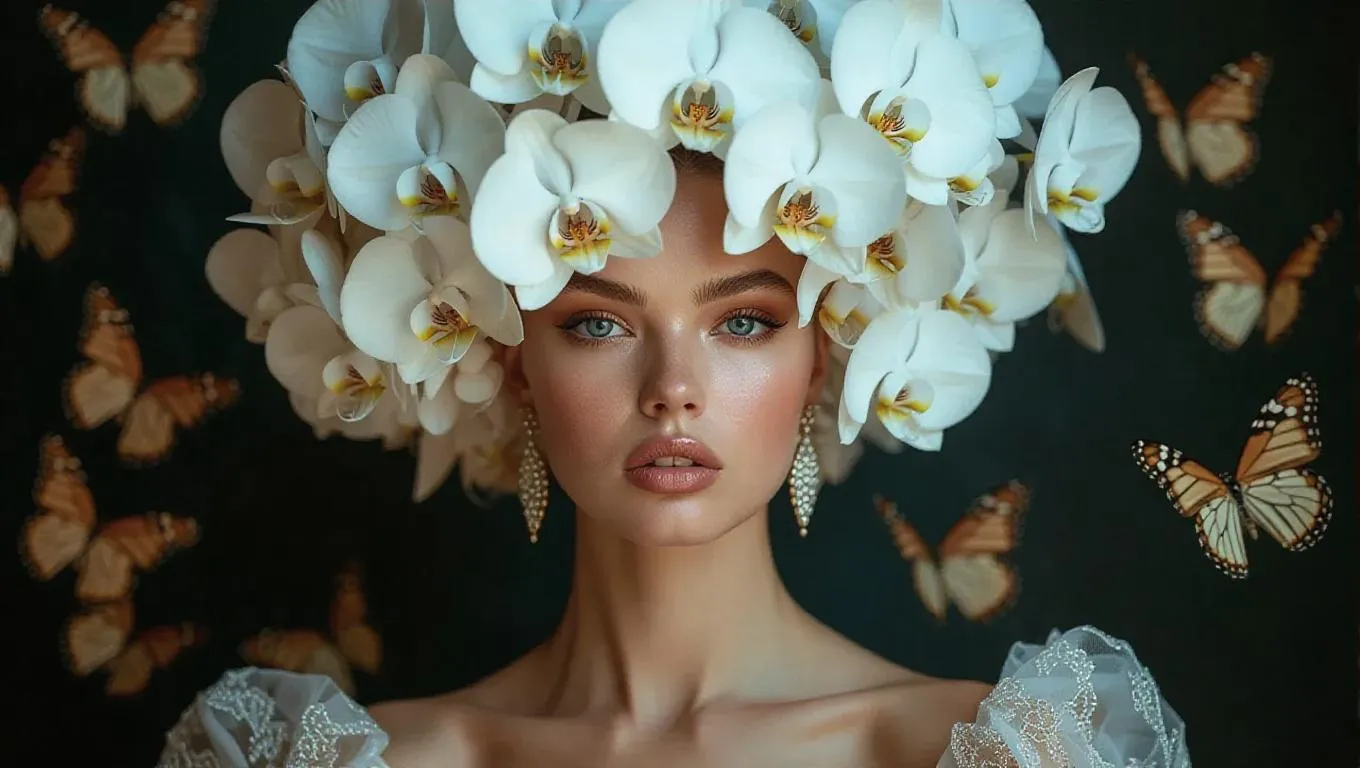 Create stunning high-fashion editorial photos with AI. Generate images of models in elegant gowns, blooming orchid headpieces, and dramatic makeup. Capture striking poses in studio settings using Leica Q2's 50mm lens and butterfly lighting. Perfect for Paolo Roversi-inspired photography, fashion portfolios, and professional-grade AI visuals. Transform concepts into high-end visuals effortlessly.