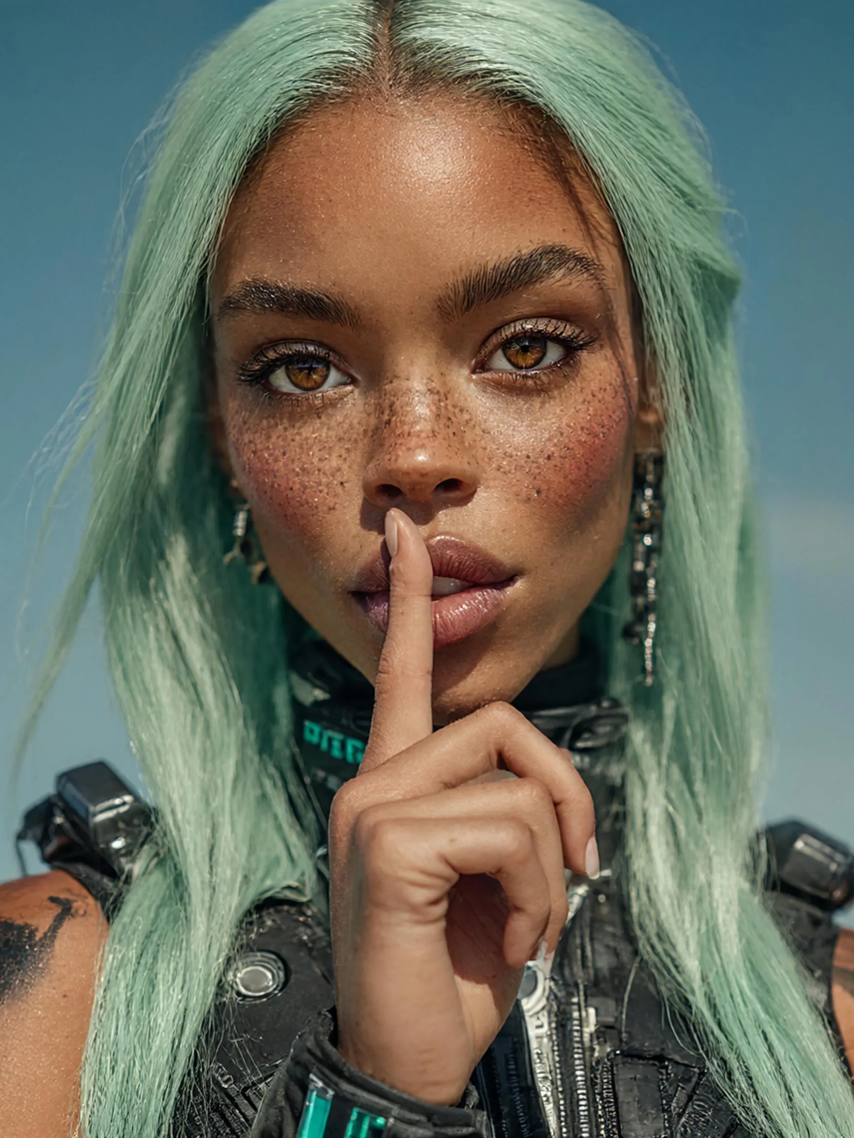 Create a stunning photorealistic magazine cover with AI. Generate a two-spirit Shirren influencer in cyberpunk attire, featuring galactic skin, ocean-deep eyes, flamingo legs, and mint green hair. Perfect for a high-end Petrobras campaign in Hollywood. Achieve this unique, high-fashion, Pinterest-worthy look effortlessly with Vivago.ai's powerful image generator.