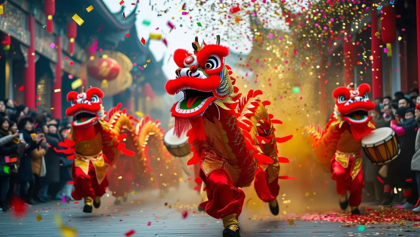 Capture the raw energy of a traditional Chinese dragon dance with AI-generated visuals. Vibrant red and gold costumes swirl amid dynamic drumbeats, confetti bursts, and cultural authenticity. Perfect for showcasing festive celebrations, this 16:9 high-detail image merges tradition with AI creativity for eye-catching event promotions or cultural content.