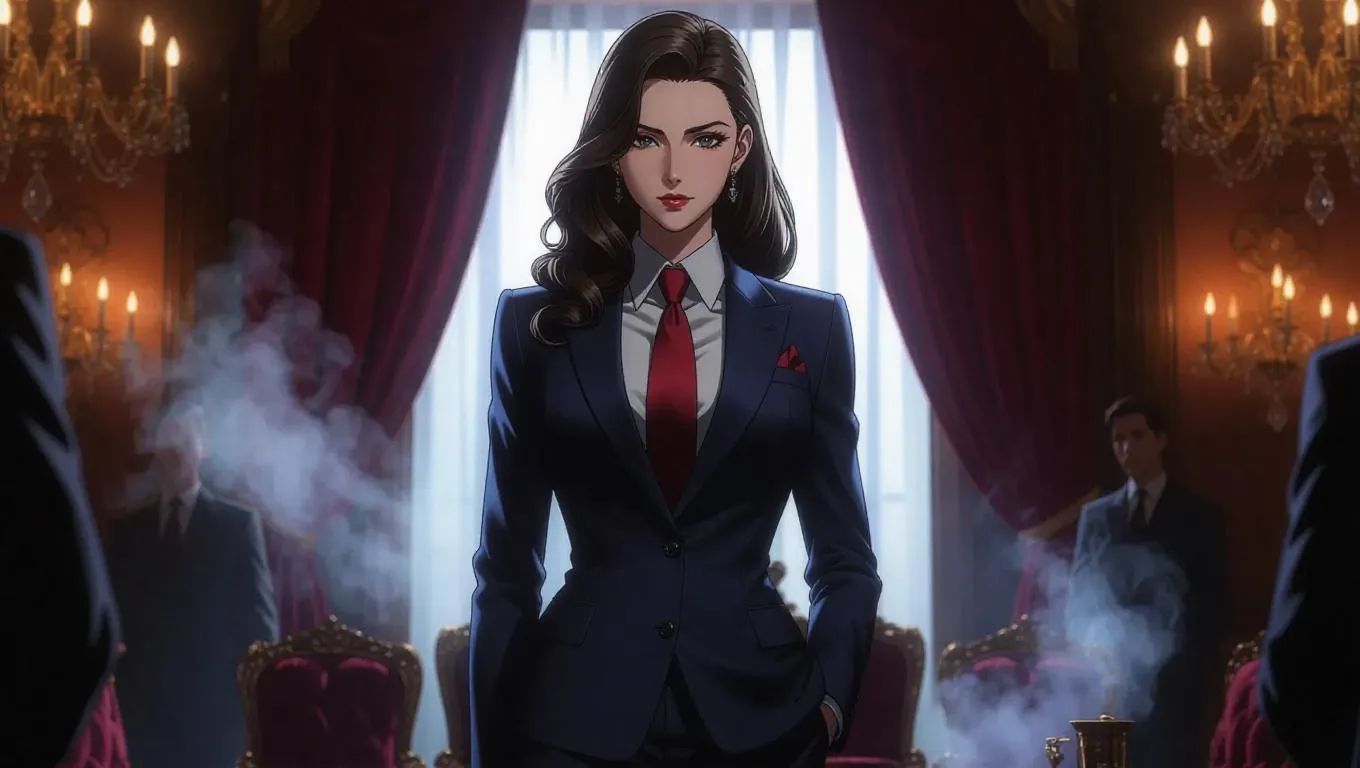 Fantasy realm animated anime hot mafia boss woman, married, exuding confidence and charisma, adorned in a sleek, dark suit with a crimson tie, standing in a dimly lit, opulent room with velvet drapes and ornate chandeliers, surrounded by hazy smoke and shadowy figures, radiating power and allure.
