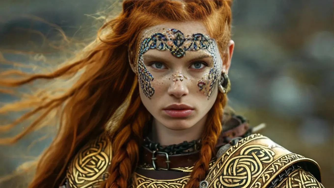 Create a striking AI-generated portrait of a Viking warrior woman with fiery red hair, intricate facial tattoos, and golden Celtic-adorned armor. Features leather detailing, bold ear piercings, and a commanding gaze. Ideal for fantasy art, Norse mythology visuals, and powerful female character design inspiration.