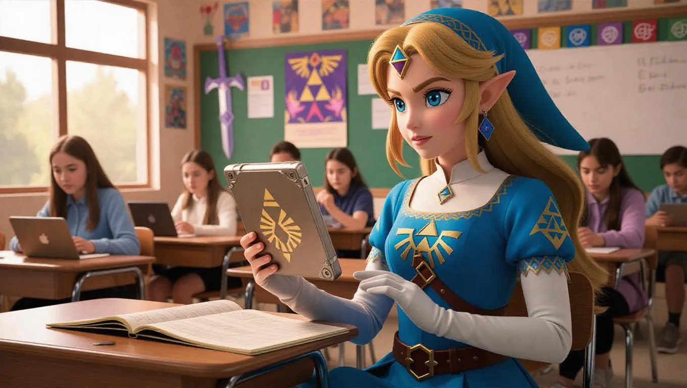 AI-generated image reimagines Princess Zelda in modern high school, blending her iconic Hylian gown with sneakers and tech. Sheikah Slate meets smartphone math, Hyrulean ruins contrast classroom whiteboards. Perfect fantasy-meets-modern AI art merging Legend of Zelda nostalgia with contemporary teen life. Explore timeless wisdom clashing with digital age through vivid, detail-rich AI effects.