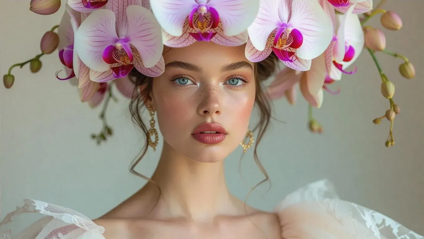 Create stunning high-fashion editorial photos with AI. Generate images of models in elegant gowns, blooming orchid headpieces, and dramatic makeup. Capture striking poses in studio settings using Leica Q2's 50mm lens and butterfly lighting. Perfect for Paolo Roversi-inspired photography, fashion portfolios, and professional-grade AI visuals. Transform concepts into high-end visuals effortlessly.