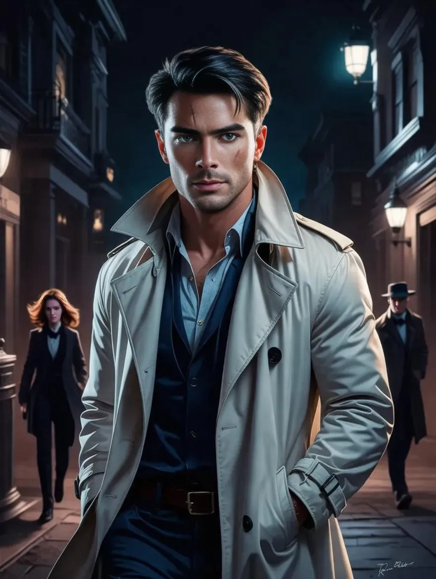 Explore John Taylor's gritty world in hyperrealistic AI-generated ink art. This neon-noir Nightside scene features the rugged PI harnessing inherited powers to uncover secrets. Vivid full-body illustration merges graphic novel aesthetics with dark, sleazy architecture, capturing ominous shadows and supernatural mystery. Perfect for AI art enthusiasts seeking edgy character designs or atmospheric noir storytelling visuals.