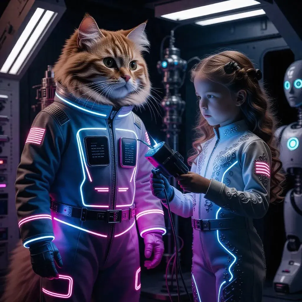 AI-generated cyberpunk art featuring an anthropomorphic ginger cat in a neon-glowing space-age jumpsuit and a futuristic girl welding a robot. High-resolution visuals blend intricate patterns, glowing accents, retro-futuristic tech, and vivid sci-fi storytelling. Perfect for AI image generation enthusiasts seeking imaginative, detailed characters in a dynamic, neon-lit industrial setting.