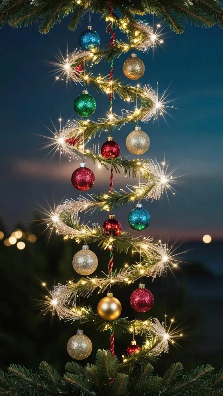 Create a magical Christmas scene with AI-generated radiant garland spirals resembling twinkling trees. Craft dazzling ornaments, glittering tinsel, and fragrant pine boughs in festive hues. Transform text prompts into enchanting holiday visuals with warm, shimmering lights and lifelike details, perfect for crafting whimsical AI-powered celebrations or eye-catching seasonal content.
