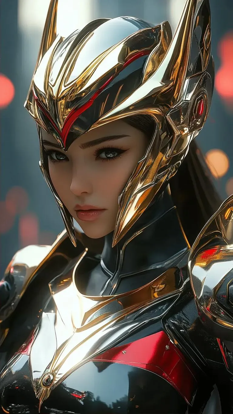 Generate hyperrealistic AI art of a futuristic female warrior in intricate gold-red armor, featuring sharp robotic designs and a mythic-inspired helmet. Set against a soft-blurred futuristic cityscape with dramatic lighting, blending anime elegance and realistic strength for heroic impact. Explore AI image generation at VivaGO.ai.