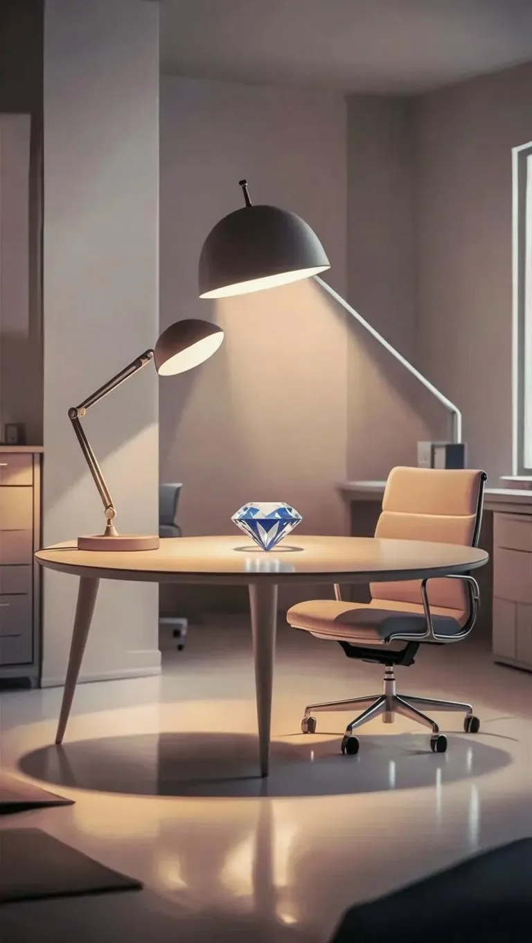Craft a poignant 3D cartoon-style scene with AI: a delicate diamond ring rests on a sleek office desk under soft lamp glow. Minimalist empty space, muted tones, and executive chair amplify melancholic farewell vibes. Transform emotional narratives into visual stories using vivago.ai's AI image generation for reflective, symbol-rich scenes.
