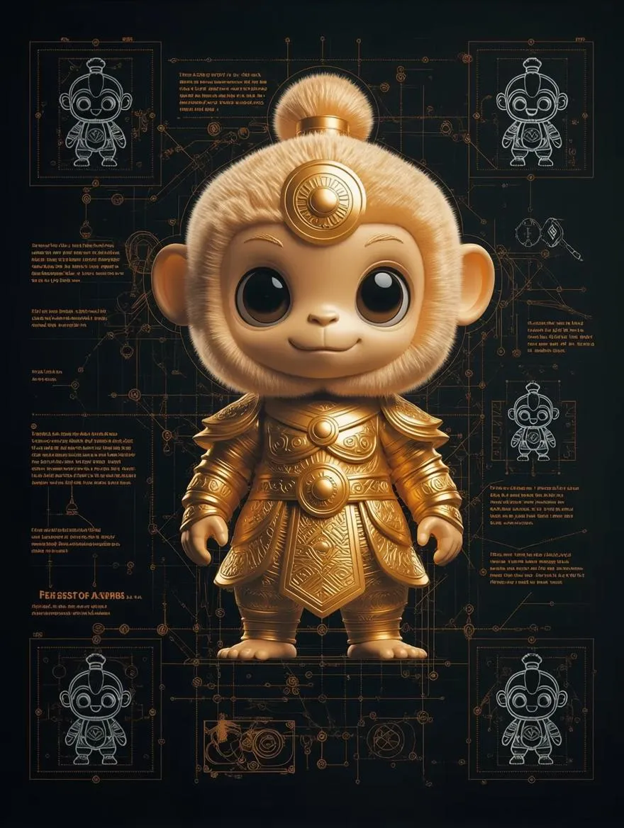 以蓝图的风格制作Q版的齐天大圣吉祥物玩偶,金色毛茸茸,设计草图。并包括尺寸和解释性文本注释。应使用线条和测量值来指示各个部位的尺寸,给草图以技术和详细的感觉。除了主要设计外,还包括显示不同角度的零散缩略图,立体景深,高清细节,黑色背景