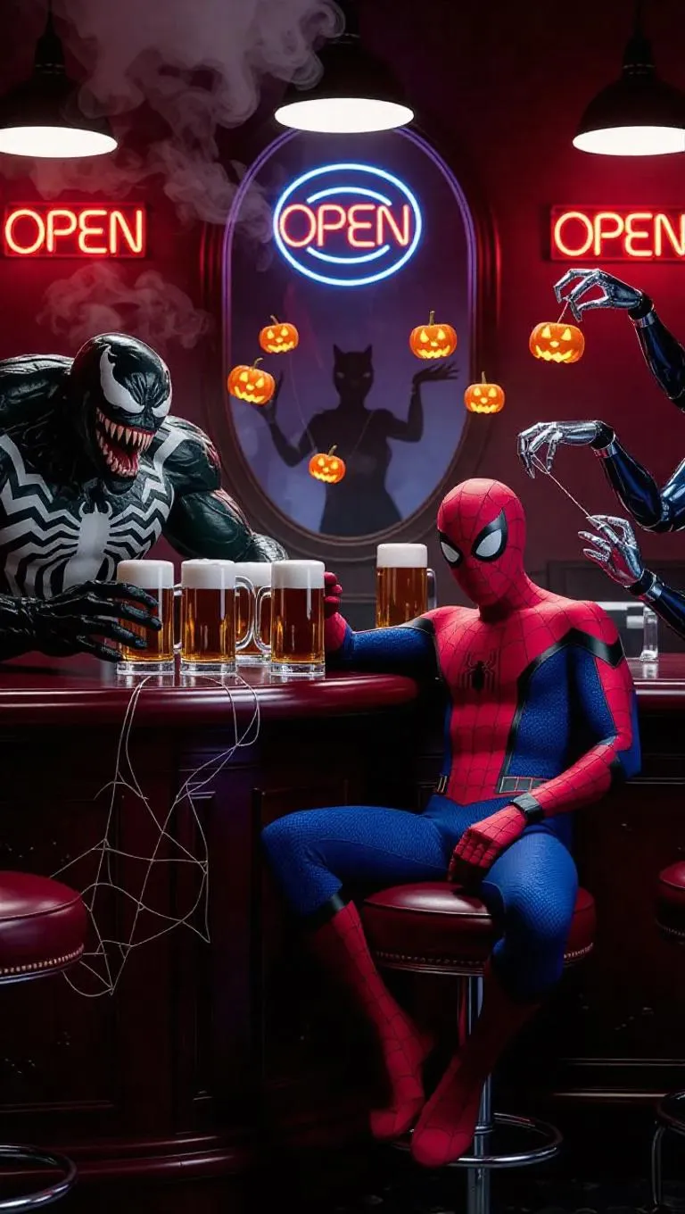 A gritty Neo-noir tavern scene: Spider-Man slouches at a polished mahogany bar, half-mask peeled above his nose revealing stubble, clutching a frosted beer stein. Surrounding him - Venom's inky mass oozing over a barstool tendrils gripping three tankards, Green Goblin's pumpkin bomb earrings glowing amber under neon "OPEN" signs, Doctor Octopus' actuators playing darts with web-silk fletchings. Smoky air thick with suspended beer foam bubbles, warped mirror behind bar reflecting Black Cat's silhouette stealing the cash register. Dramatic chiaroscuro lighting from flickering Edison bulbs casts long shadows across spilled lager puddles refracting costume details - spider emblems, goblin scales, symbiotic textures. Fisheye perspective emphasizing tense camaraderie, 35mm film grain texture overlay.