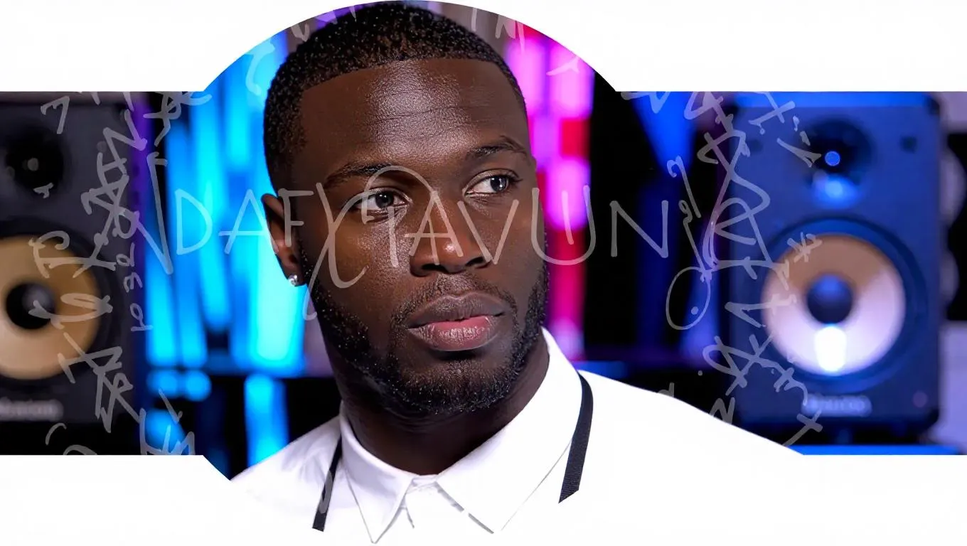 Create stunning AI photography of Adam Gawns in a music studio. Generate flawless, professional-grade images with beautiful backgrounds. Highlight his dark skin tone and capture his eyes clearly. Perfect for outstanding visuals using AI image generation tools.