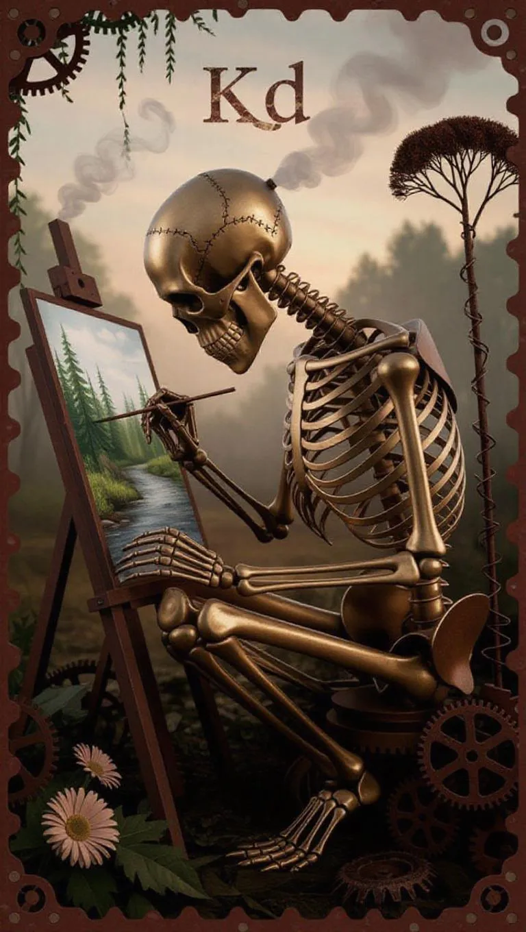 A hyper-detailed, metallic skeletal figure with exposed gears and brass limbs, hunched over in a quiet, ruined landscape. It holds a delicate brush made of copper and bone, painting fading memories of the natural world onto rusted steel canvas—lush forests, rivers, animals once real, now only strokes of oil and soot. Steam vents gently hiss from its spine, its face a polished skull with faint etchings of forgotten flora. Around it, remnants of the past: wilted flowers cast in iron, vines made of wire, trees reduced to cogs. A solemn atmosphere of melancholy and reverence, as if the machine mourns the nature it replaced. Soft golden light filters through smog, glinting off chrome surfaces. Style reminiscent of steampunk mixed with post-apocalyptic surrealism, rich in texture, with a contrast of organic memory and cold mechanical present