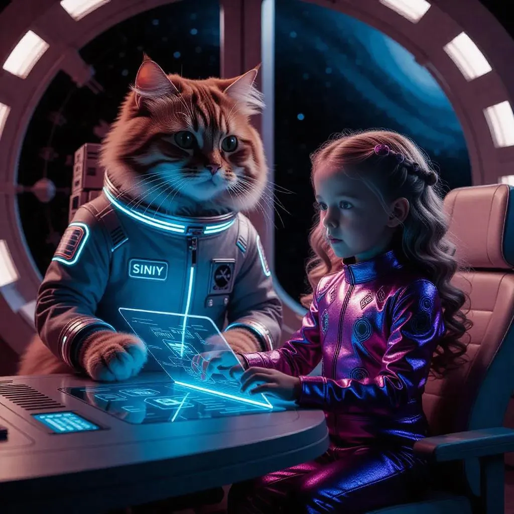 Generate AI images of a futuristic spaceship with a cyberpunk anthropomorphic cat and a blonde girl in glowing neon jumpsuits. Explore intricate spaceship interiors, translucent tech devices, and cosmic views through portholes. Create vivid sci-fi scenes with AI-powered tools for high-resolution, professional visual storytelling.
