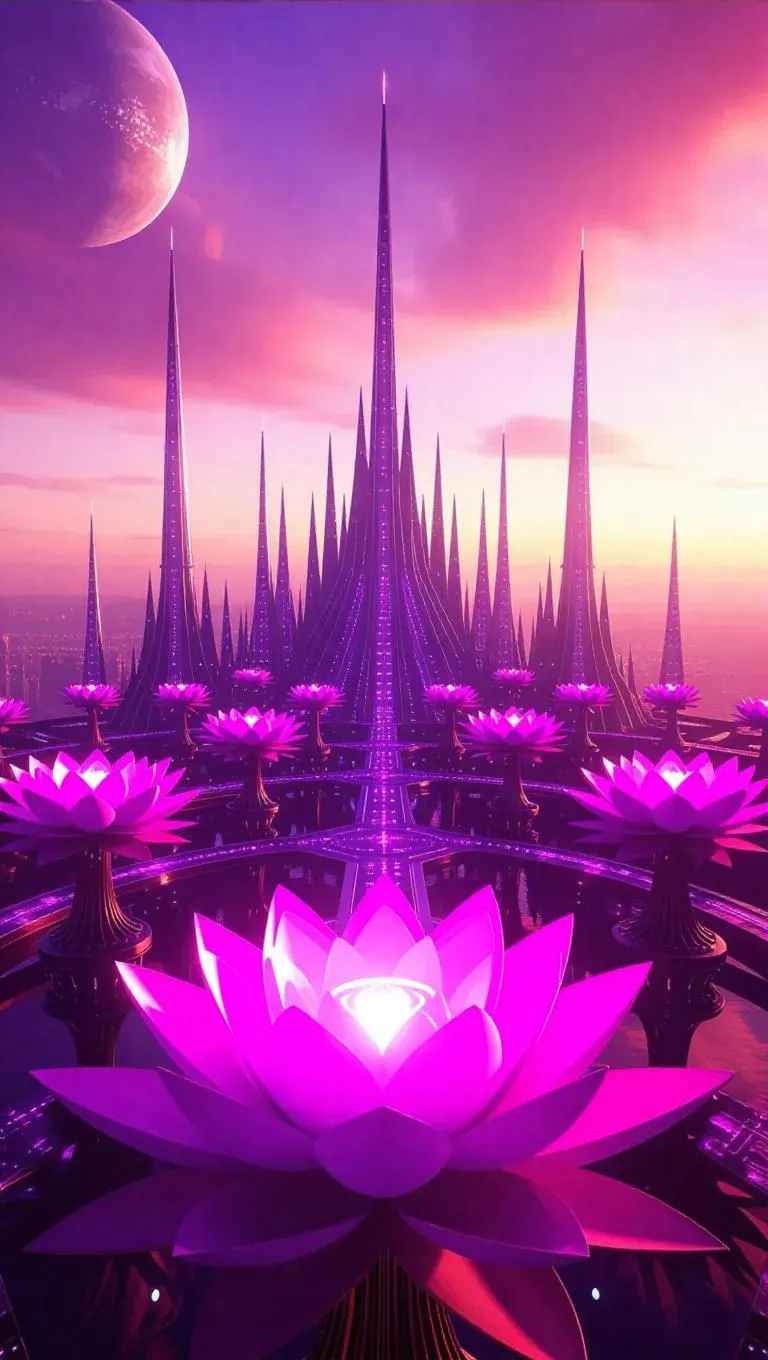 Generate AI-powered visions of the Queen of the Lotus Spires - cosmic utopia with luminous lotus towers, zero-point energy biodomes, and crystalline data obelisks. Create gravity-defying platforms, neural interface networks, and symbiotic consciousness visuals through advanced AI image/video generation tools for celestial worldbuilding and sci-fi artistry.
