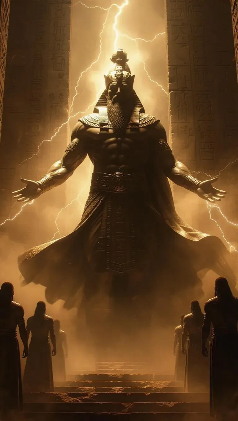 Experience Enlil, Sumerian god of storms, in AI-generated art. Emerging from ancient ziggurats, his divine stone form commands swirling sandstorms and crackling lightning. Glowing cuneiform runes orbit his colossal figure as priests kneel beneath celestial fury. Perfect for mythology-inspired AI visuals blending divine power, elemental chaos, and historic mystique with cutting-edge generative effects.