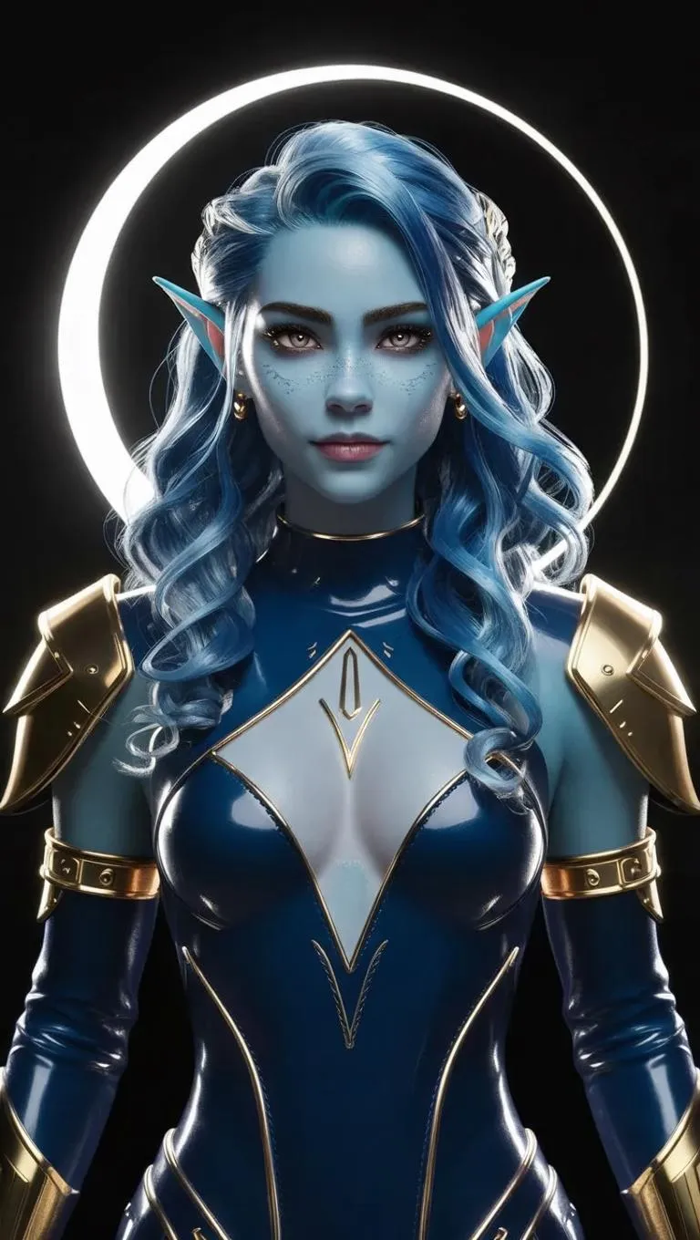 Create hyperrealistic AI art of a futuristic elf with cyan skin, long blue hair, and a vinyl outfit. Featuring intricate League of Legends-inspired details: gold gauntlets, war shoulder pads, and a deep neckline. Soft illumination highlights rich textures against an eclipse-black backdrop. Ideal for high-resolution fantasy character design, blending cyberpunk aesthetics with ethereal elegance. #AIArt #Hyperrealism #CharacterDesign
