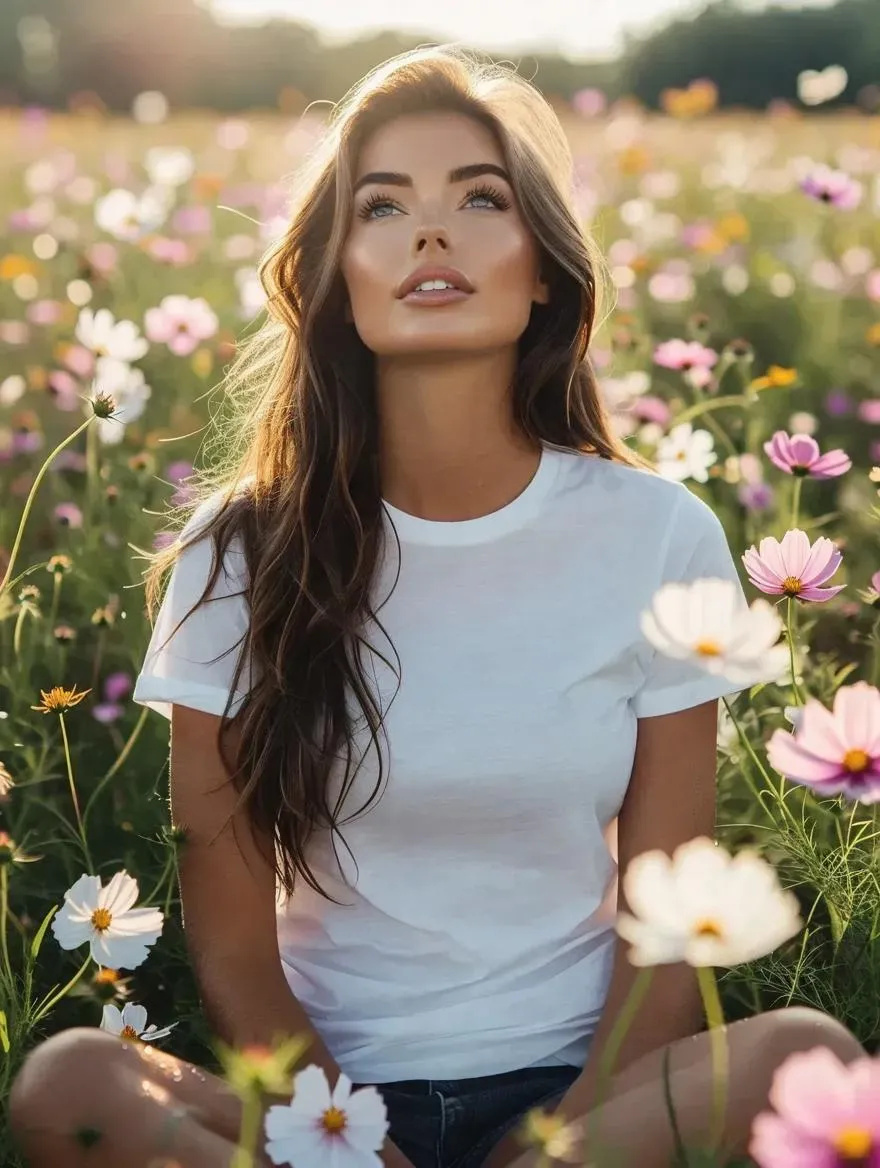 Generate a captivating AI image of a sultry woman in a vibrant flower field, blending surprise and satisfaction. Vivago.ai crafts hyper-realistic visuals: soaked white t-shirt clinging to her torso, dynamic lighting, and lifelike floral textures. Elevate creativity with AI-powered precision for stunning, professional-grade photo effects.