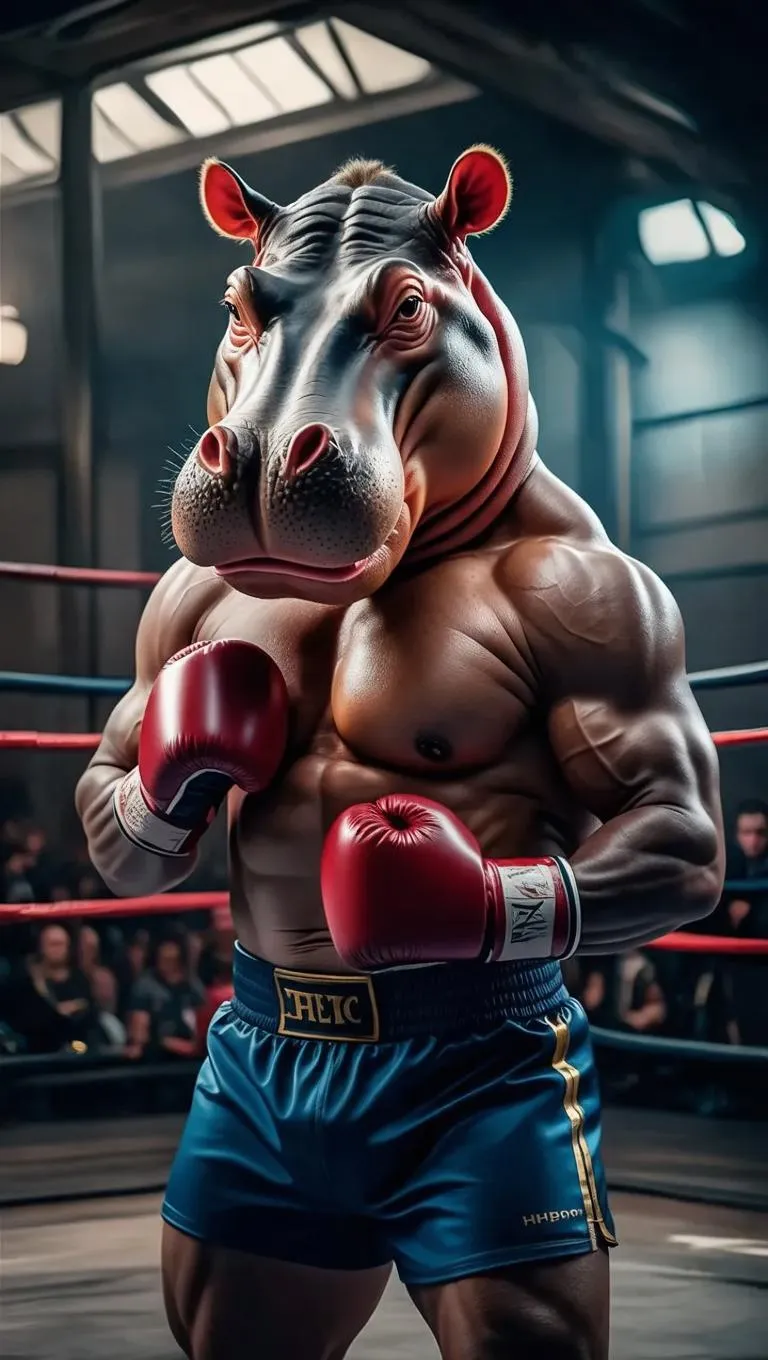 Generate hyper-realistic AI art of a half-man half-hippopotamus fighter with meticulous textures, dynamic combat scenes, and mythical hybrid anatomy. Elevate fantasy character designs using AI effects for professional-grade creature art, blending human strength and hippo resilience in striking visual storytelling.