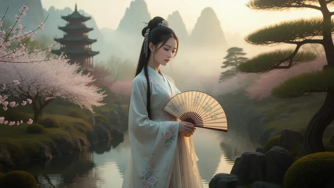 Create AI-generated traditional Chinese art with a serene silk hanfu-clad woman amid misty cherry blossoms and Shan Shui landscapes. Blending intricate floral embroidery, jade hairpins, and ink-wash textures with ethereal fog, winding rivers, and dreamy crane-filled skies—ideal for cultural storytelling, artistic projects, or Asian-inspired digital aesthetics.