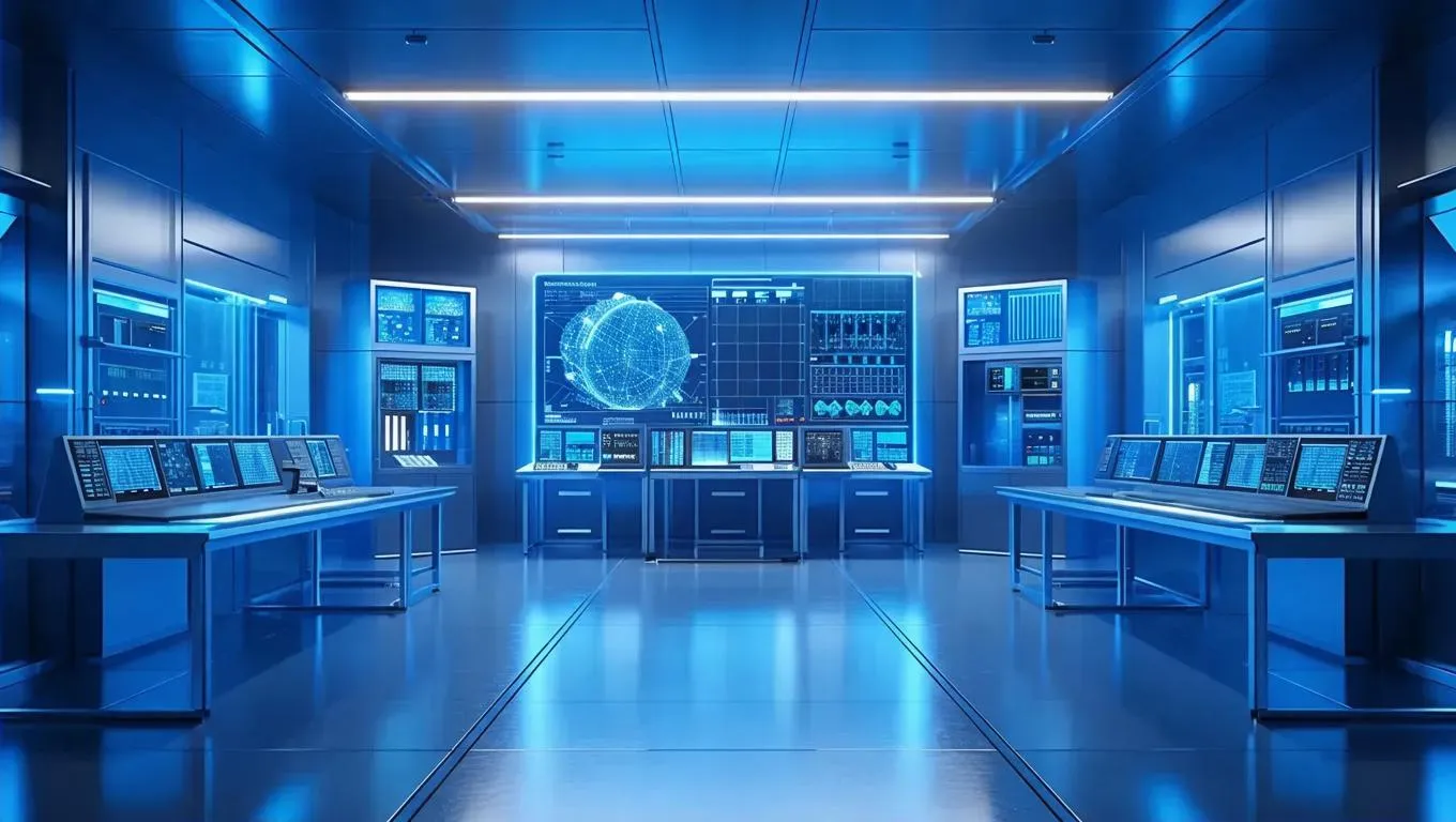 Ultra-detailed 8K virtual lab simulation background with algorithm hubs, control panels, and intricate blue-themed design. Ideal for AI modeling projects requiring hyper-realistic environments, professional-grade precision, and cinematic-quality visual storytelling in scientific visualization.