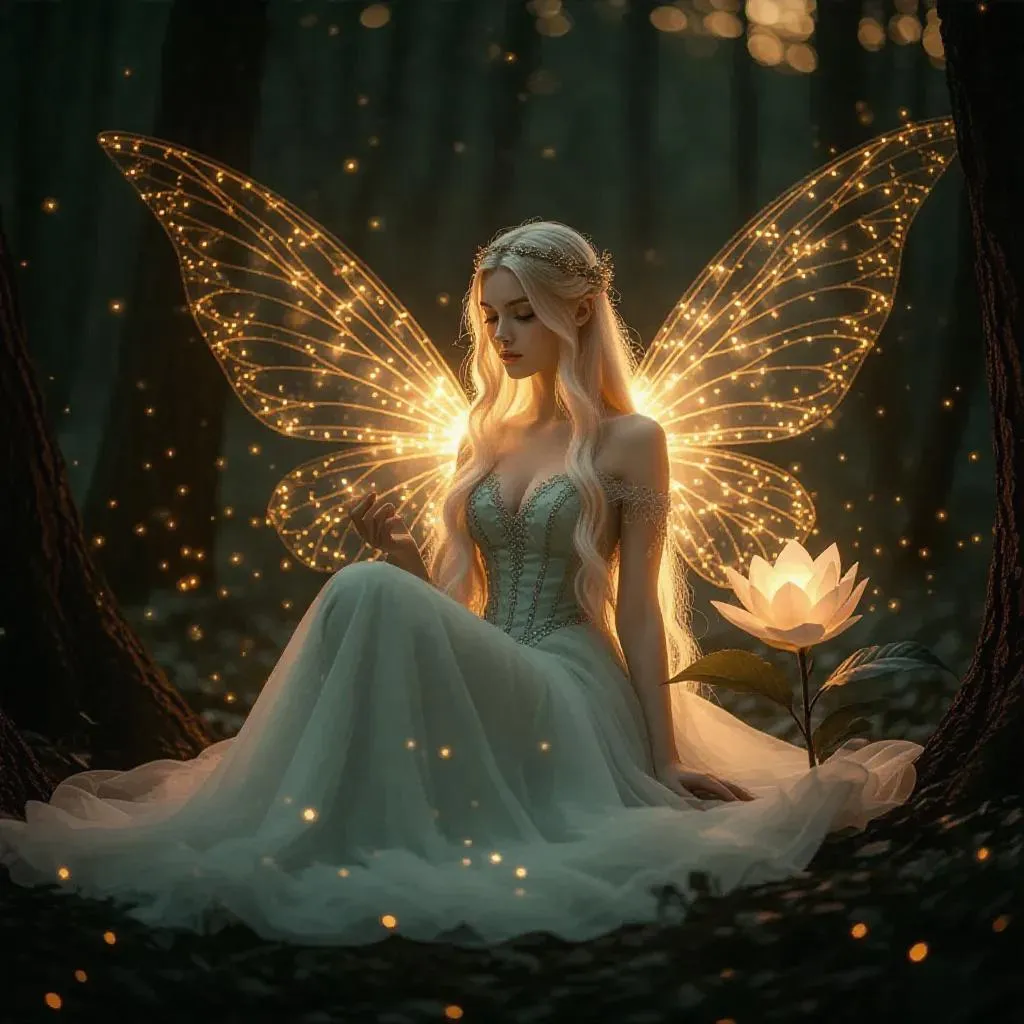 Create an AI-generated mystical fairy with golden-orange wings in an enchanted forest. VivaGo AI transforms text prompts into ethereal scenes featuring magical flowers, glowing fireflies, and a pale green moonlight dress. Perfect for fantasy art, book illustrations, and mystical ambiance.