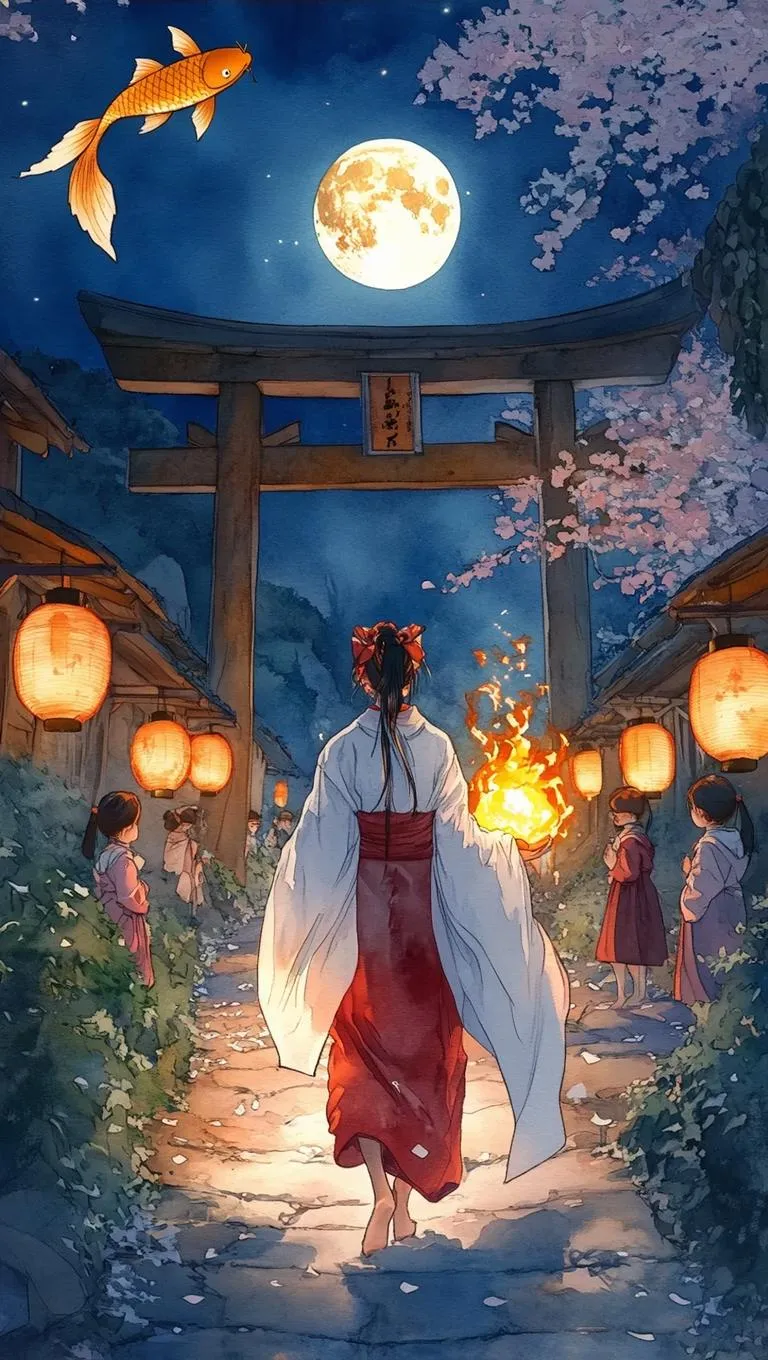 Capture ethereal anime scenes with a divine shrine maiden at a moonlit village festival, glowing memory-fire orbs, and lantern-lit sakura paths. Rendered in watercolor ink with Ghibli-style reverence, this cinematic artwork blends sacred folklore, golden koi spirits, and festive torii gate mystique. Perfect for anime, cinematic, and Japanese Ukiyo-e inspired visual storytelling. #Anime #Cinematic #JapaneseUkiyo-e