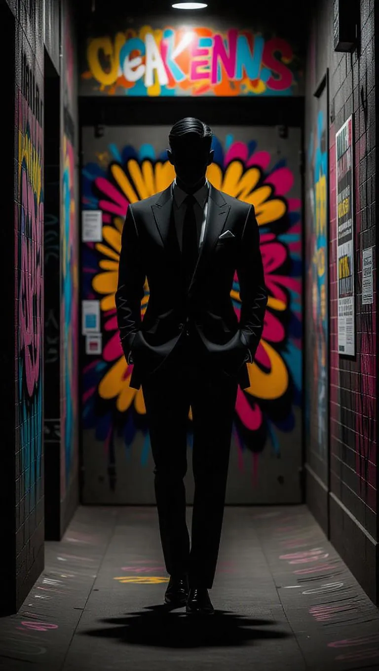 Create striking AI urban art with vivago.ai. Generate high-contrast silhouetted figures in tailored suits against vibrant graffiti backdrops. Merge realism and street art in moody alleyways with dramatic lighting, dynamic edges, and textured walls. Perfect for edgy, sophisticated visuals capturing modern urban life's mystery. AI-powered tools for professional-grade compositions with dominant perspectives and visual tension.