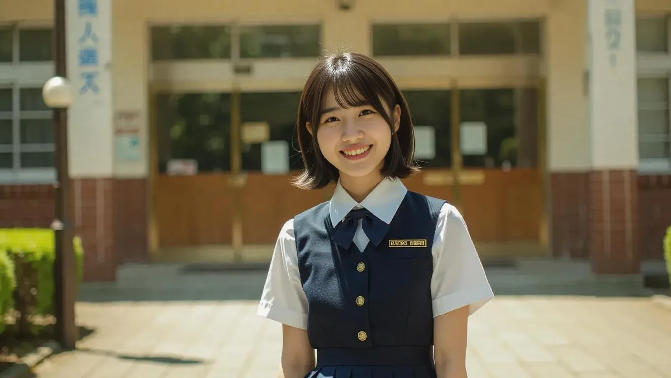 Generate a vintage Polaroid-style AI photo of a smiling Japanese schoolgirl in uniform, posing at a high school entrance. Explore retro filters, anime-inspired character design, and nostalgic school aesthetics with AI image generation tools for authentic 1990s film camera effects.