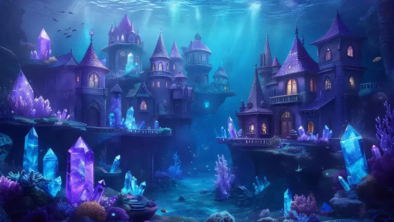 Dive into an AI-generated underwater cityscape illuminated by glowing blue light, featuring ancient architecture and radiant blue-purple crystals. Transform prompts into surreal visuals with Vivago.ai’s tools for mesmerizing, bioluminescent scenes and professional-grade creative exploration.