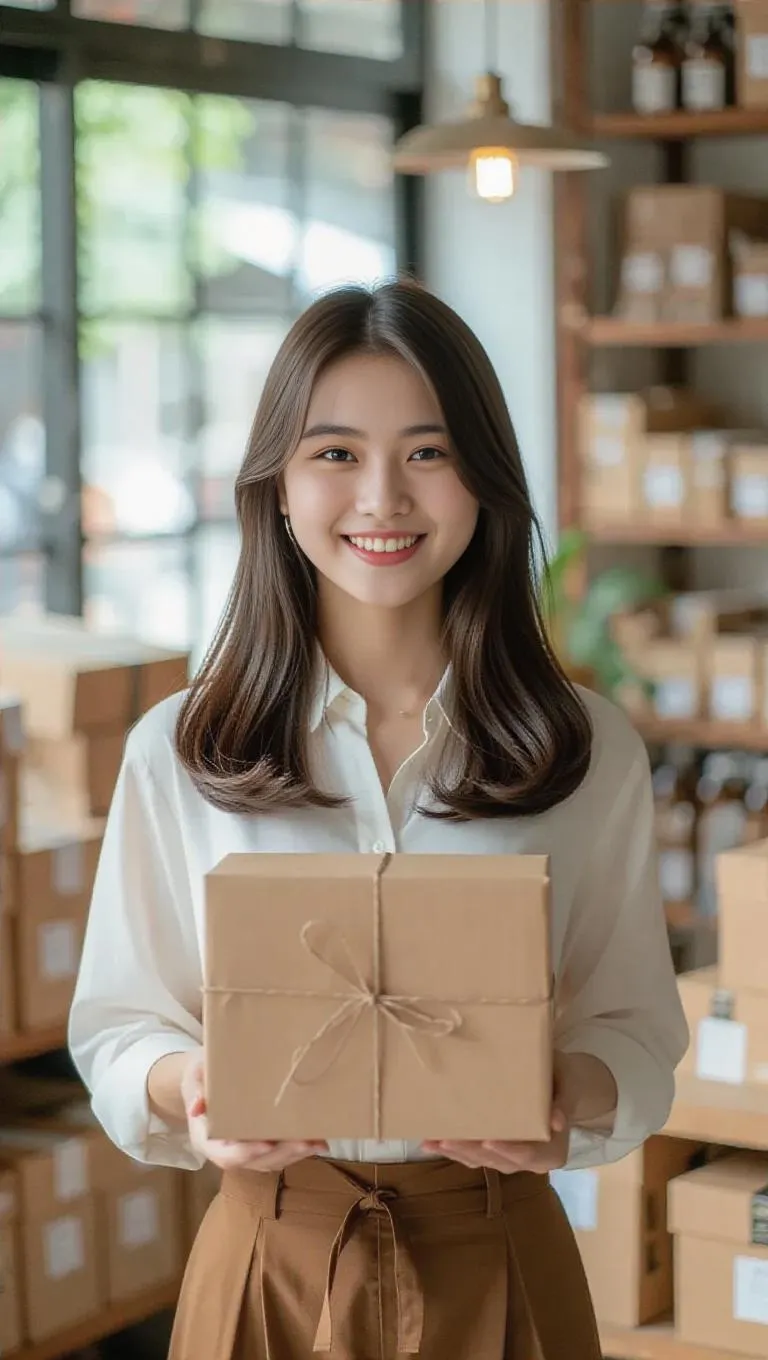 Create a vibrant AI-generated image of a cheerful 20-year-old Thai woman with fair skin, brown hair, and a warm smile. Featuring thick eyebrows, a hump nose, and stylish T-shirt attire, she politely holds a brown box in full-body HD view. Perfect for showcasing youthful charm, professional aesthetics, and realistic AI-powered character design.
