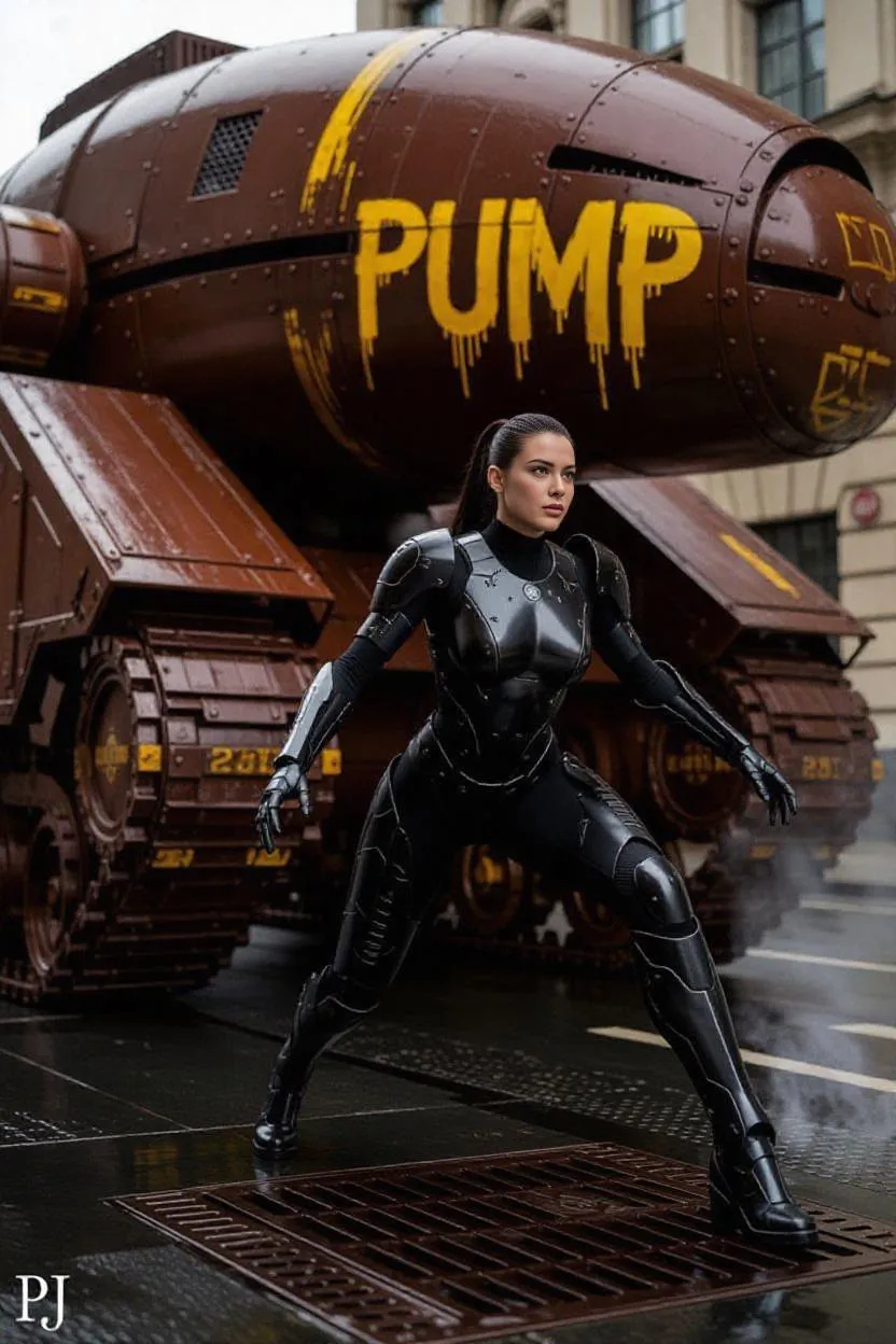 Generate cinematic cyberpunk art: A warrior woman pilots a battle-damaged cyber-dragon hover-tank over rain-slick streets. Futuristic symbols glow on her armor amidst towering holographic skyscrapers. Dramatic volumetric neon light cuts through smog. AI creates this dynamic, rule-of-thirds composition with gritty textures & cinematic blue/neon color grading. VivaGo.ai