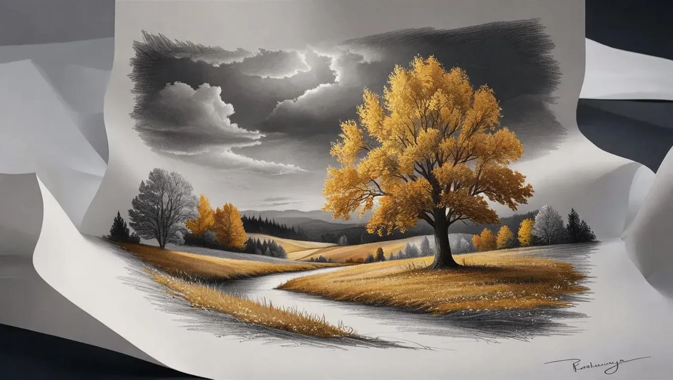 Generate a melancholic pencil sketch autumn landscape with detailed hatching. Vivago.ai's AI transforms text into surreal, minimalist scenes: leafless tree, cloudy sky, muted tones on white paper. Explore Romanticism, Country Style, and Modern Minimalist effects for professional-grade AI art using creative tools.