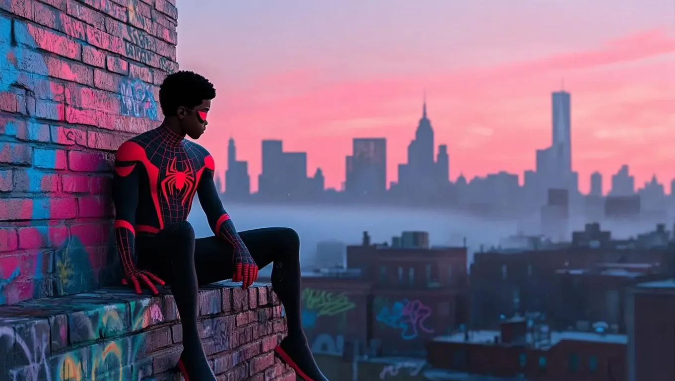 Create a photo-realistic AI-generated image of Miles Morales perched on a graffiti-covered brick wall at dawn, with vibrant pink and blue hues illuminating his suit. Vivago.ai transforms text prompts into stunning visuals, blending reflective moods and detailed city skylines for professional-grade creative projects.