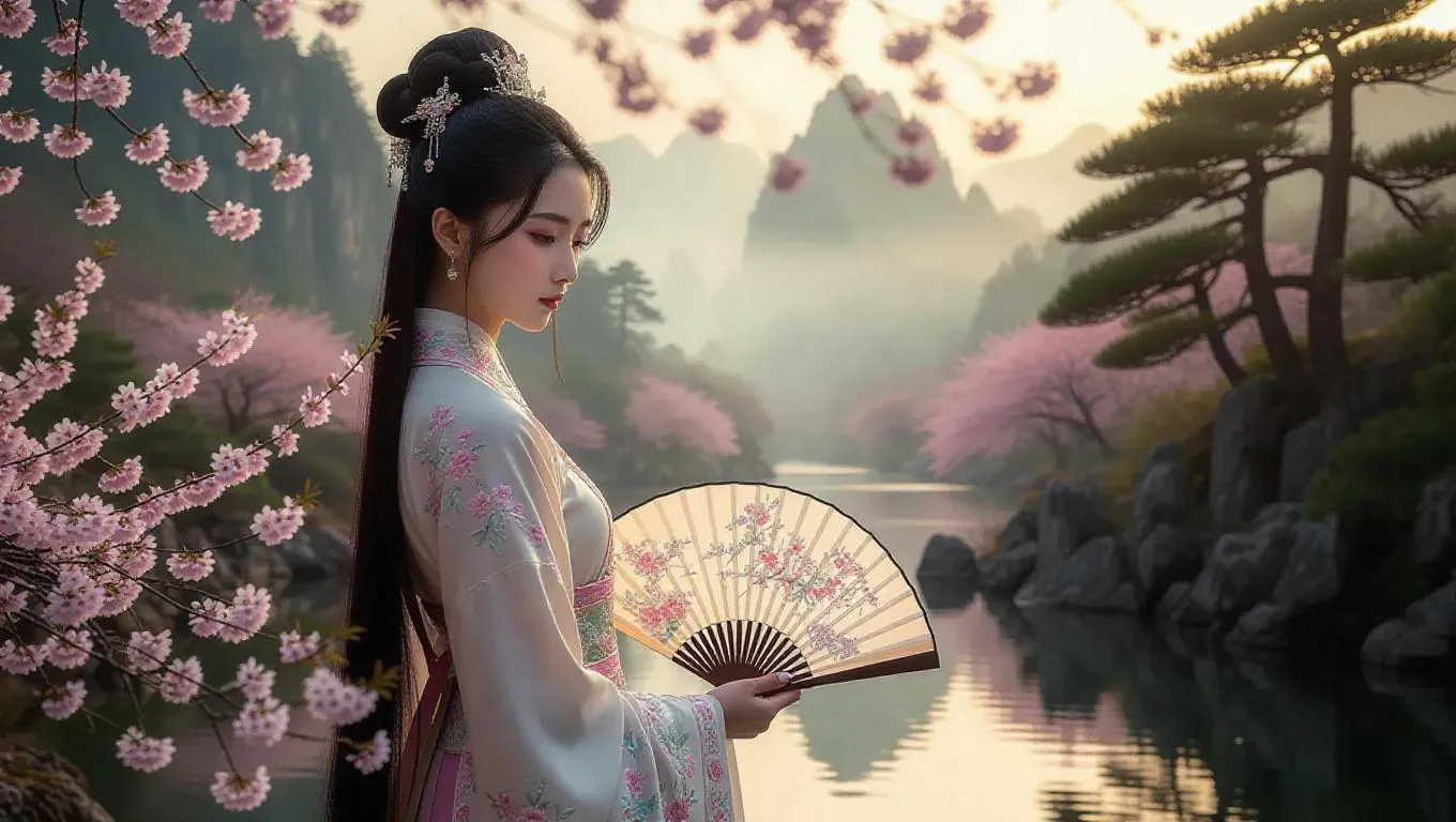 Create AI-generated traditional Chinese art with a serene silk hanfu-clad woman amid misty cherry blossoms and Shan Shui landscapes. Blending intricate floral embroidery, jade hairpins, and ink-wash textures with ethereal fog, winding rivers, and dreamy crane-filled skies—ideal for cultural storytelling, artistic projects, or Asian-inspired digital aesthetics.