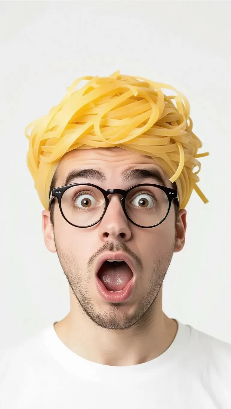 Generate a humorous AI image of a person wearing a colander as a quirky hat, highlighting surreal creativity without any pasta. Explore AI effects for unique, funny portraits with kitchen-inspired fashion. Transform text prompts into professional visuals using advanced AI tools.