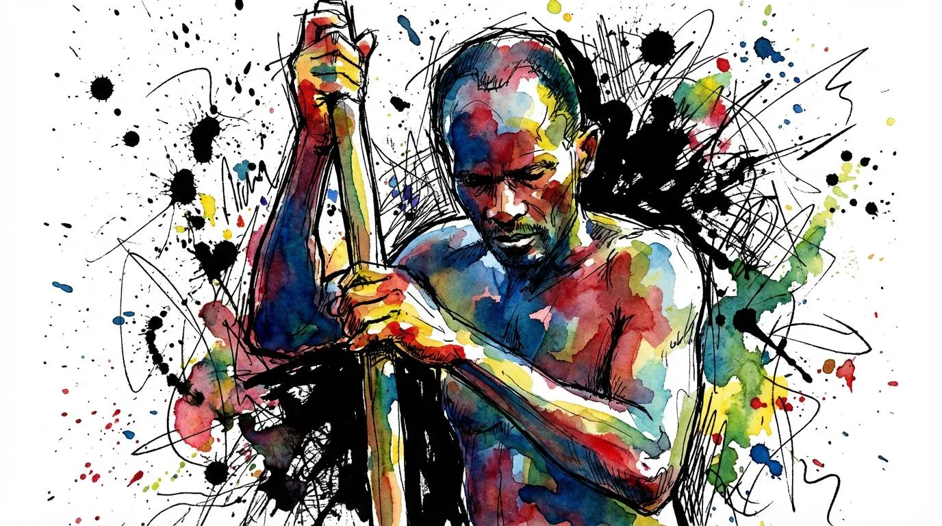 a man holds a pole rendered in bold colors in unsteady outlines in the manner of Ralph Stedman