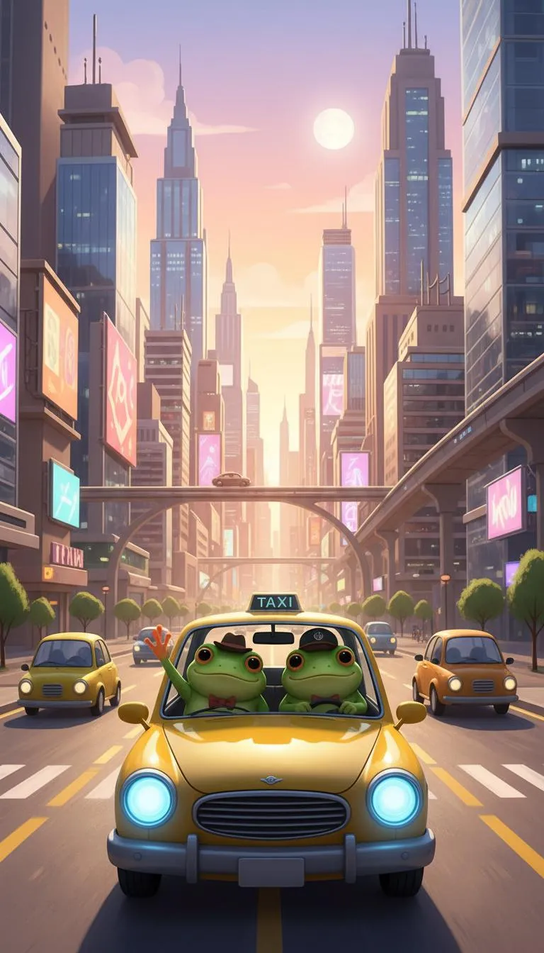 Generate charming animated cartoon frogs in a taxi cruising a modern cityscape with vivago.ai! Create vibrant, professional-grade AI artwork featuring cute, small characters riding through bustling urban landscapes. Perfect for imaginative storytelling and unique visuals.