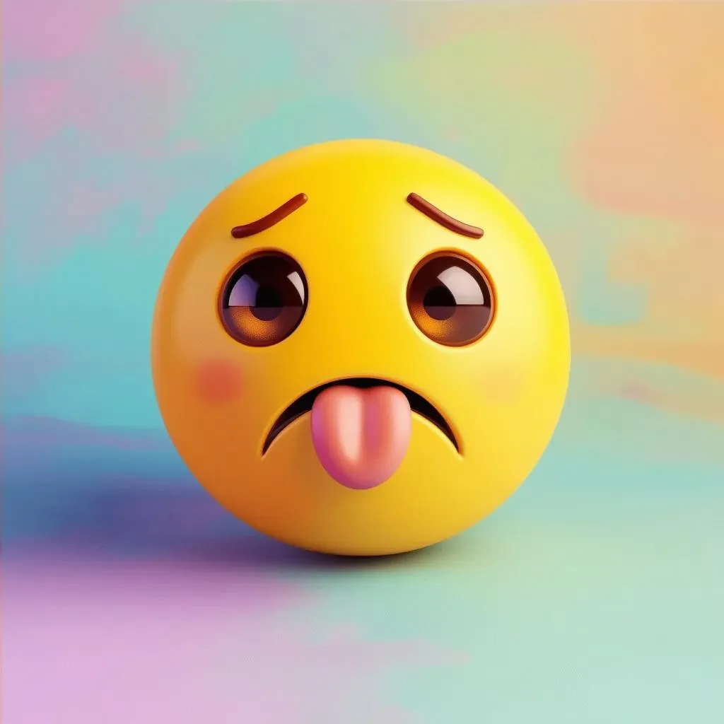 Create a sad yellow emoticon with AI: expressive brown beady eyes, a cute nose, and a tongue-out mouth. Perfect for digital content, messaging, or branding. Customize every detail with vivago.ai's AI image generator for unique, professional-grade emoticon designs.