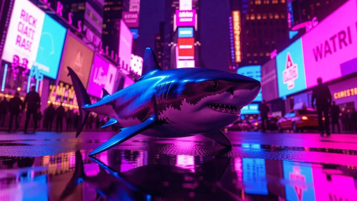 A sleek, determined shark navigating the bustling streets of a neon-lit big city, searching for a job, with skyscrapers towering above and city dwellers hurrying past, capturing the essence of urban ambition and determination.